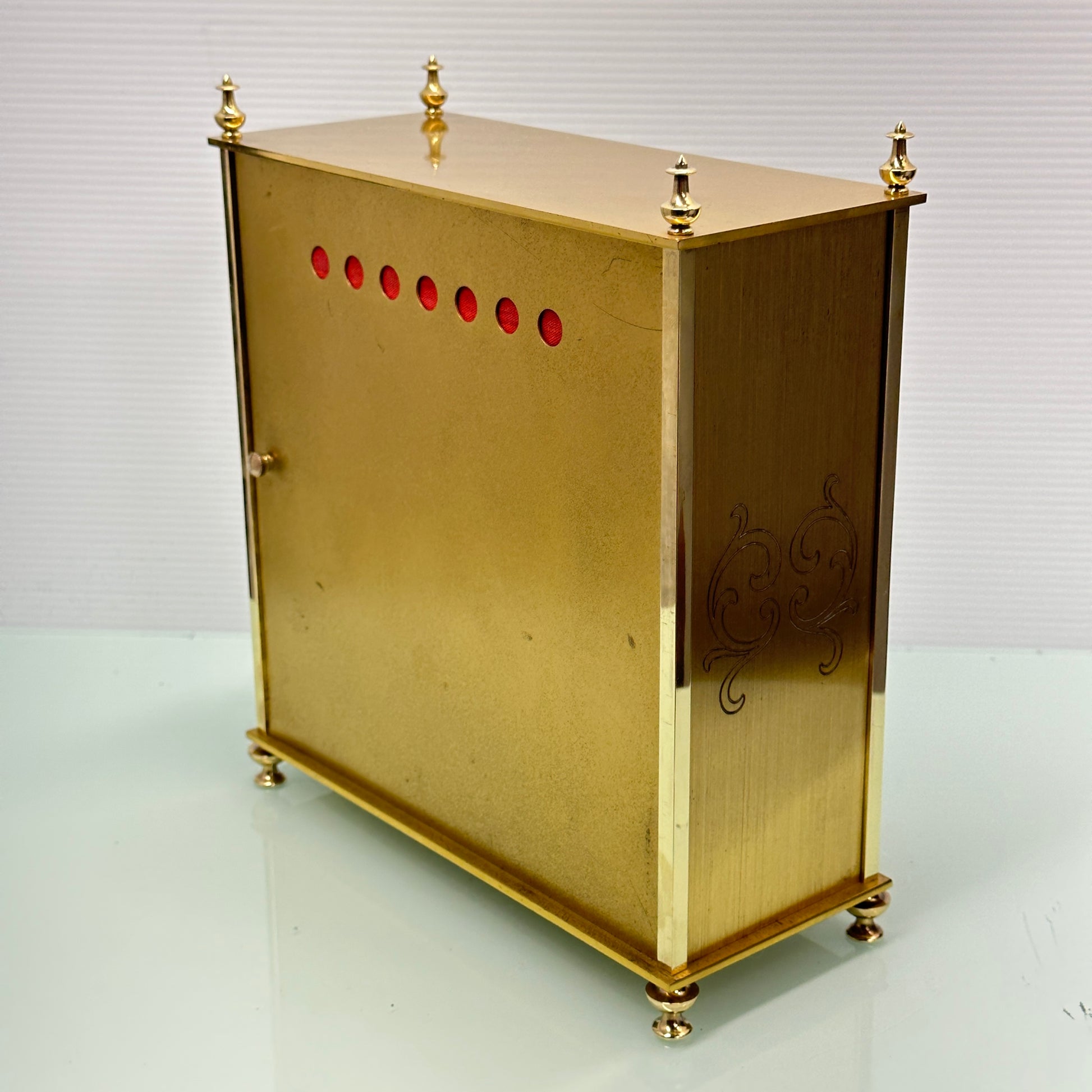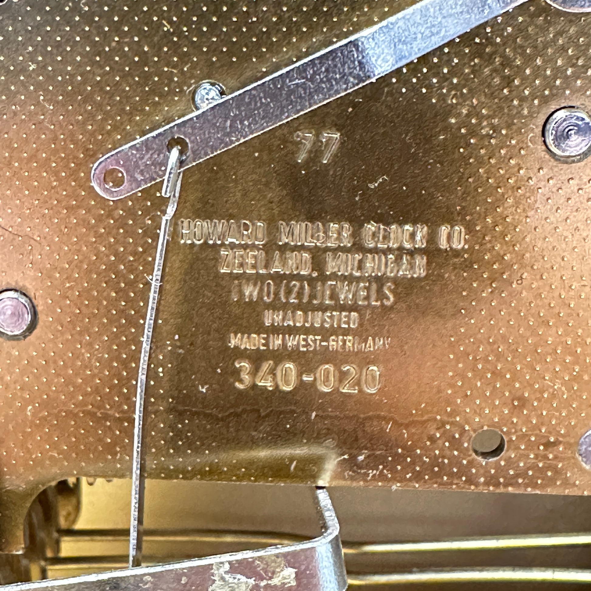 A beautiful, solid brass clock by Howard Miller. Measures 9” tall and 9” wide, featuring a gold face with Roman numerals on white enamel. The movement is a vintage Howard Miller 340-020 from 1977. The logo and model are punched, rather than new laser etched models.